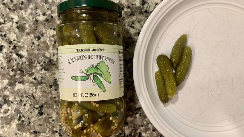 I smelled something funny and slightly artificial as soon as I opened the jar. I'm not saying that there's anything artificial going on with these pickles — the odor just made it seem so. When I bit into one, I noticed the immediate flavor was extremely sweet, almost in a hard candy-like way. Pickled candies? Not for me. This was a rare miss for Trader Joe's, and since I would actively avoid buying them from the store in the future, it was clear that the cornichons were deserving of the last place spot in this ranking.