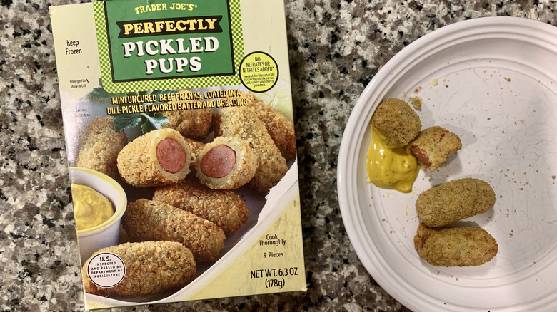 Pigs in a blanket are arguably more beloved than pickles. Everyone loves little hot weenies wrapped in dough and baked until golden-brown — right? So I was really excited when I saw that Trader Joe's carries a creative, upgraded twist on pigs in a blanket called Perfectly Pickled Pups. These are mini hot dogs coated in a crunchy, pickle-infused batter. The flavor was interesting, and in-line with the other pickle-flavored products I had already sampled for this ranking.