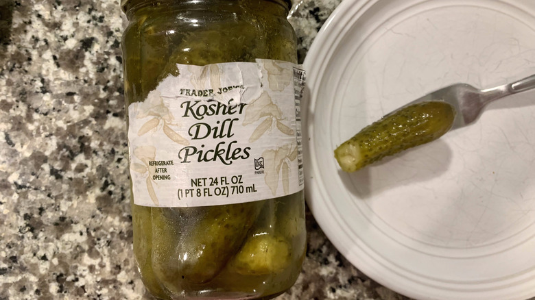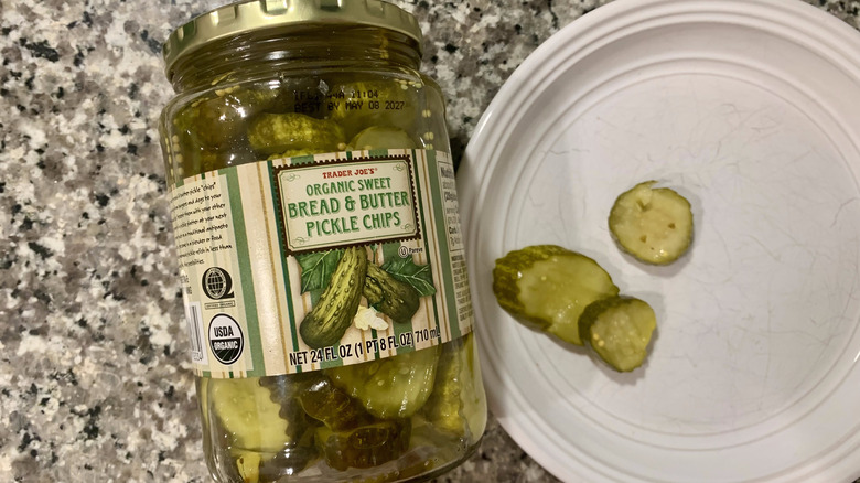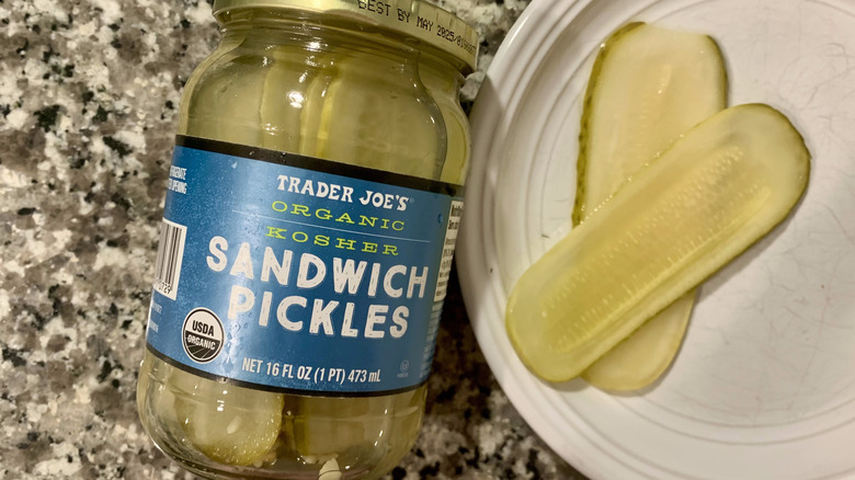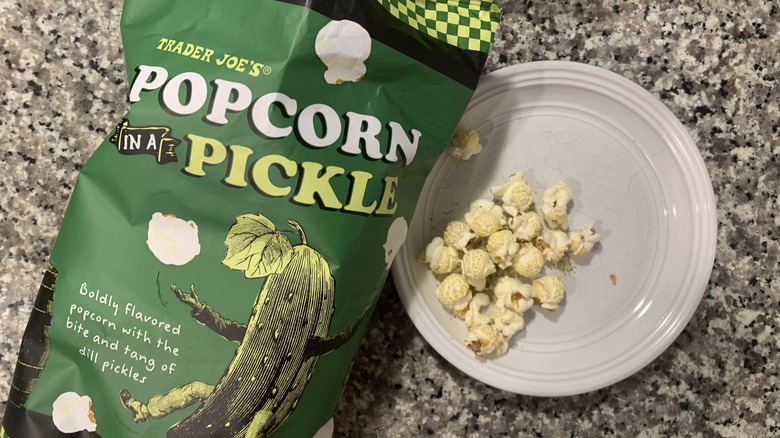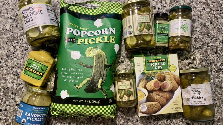 Trader Joe's carries a selection of jarred pickles, like basic kosher dill pickle chips, sandwich pickles, and bread and butter pickles. However, it also carries a few creative products that get their inspiration from pickles and infuse familiar, vinegary flavors into items like mustard and popcorn. For such a small grocery store, the number of pickle-adjacent products it offers is rather astounding.