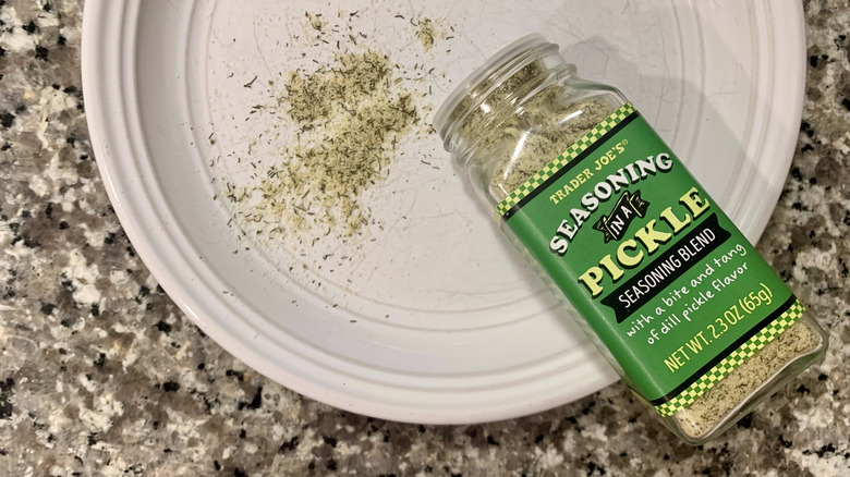 I don't often think of "pickles" and "seasoning" in the same context. Pickles are an accouterment, a snack, or a side, but they can't exactly season other foods. Or can they? Trader Joe's is famous for its inventive spice blends like Everything But the Bagel seasoning and Everything But the Elote seasoning, but attempting to put the flavor of pickles into a shaker jar just seems impossible. Wouldn't that just be, well, dried dill? It's a seasoning many of us already have lying around our kitchens and one that we don't need to buy again. But, the trader Joe's Seasoning in a Pickle is something else entirely.