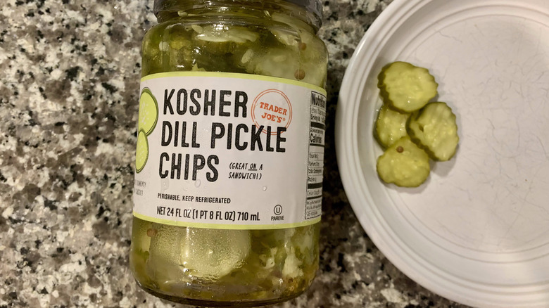 Despite being the top-ranked of all the actual pickles, the kosher dill pickle chips didn't even make it to the top three on this list. The fact of the matter is that Trader Joe's does pickle-flavored and pickle-adjacent products better than it does actual pickles. That being said, the kosher dill pickle chips are actually pretty good. The flavor of these rounds aren't spectacular and I wouldn't run out to Trader Joe's to buy them and only them. But, they will suffice in a pinch. Overall, these pickles don't have a ton of flavor, but they do taste relatively fresh and vibrant.