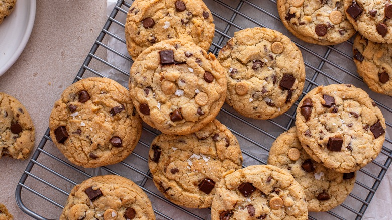 Besides adding an interesting flavor dimension and moist texture to chocolate chip cookies, olive oil is also, thankfully, an incredibly easy swap. This makes baking chocolate chip cookies with dairy-avoidant diners smooth sailing. A typical rule of thumb is that you can swap the two at a 3:4 ratio, meaning that a recipe calling for 1 cup of butter could be swapped for ¾ cup of olive oil. Try it out in this chocolate chip cookie skillet recipe, or add a new dynamic to these toffee chocolate chip cookies from Tasting Table. Olive oil is also recommended as a swap for baking recipes that call for melted butter. Extra virgin olive oil tends to have fruity dimensions to its flavor, so pairing this with dark chocolate chips in a cookie is a way to maximize both flavor and consistency.