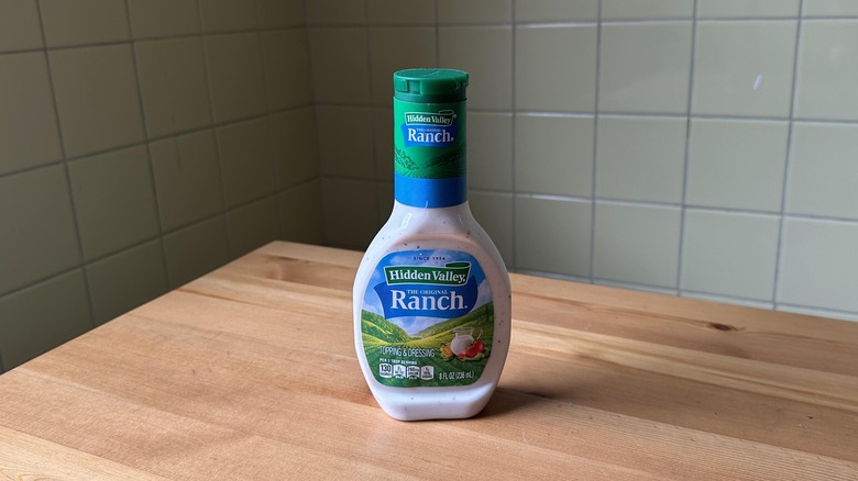 Hidden Valley's ranch dressing is absolutely iconic. It's featured on crudité platters with sliced veggies and some people even put it on pizza. And sure, it has an undeniable appeal. It's ultra-creamy and is definitely more unctuous than any of the other dressings on this list. This is likely due to the addition of buttermilk, which gives the dressing its full-bodied mouthfeel and texture. The flavor itself is bold and creamy — which makes it a dressing that actually tastes good all on its own, no baby carrots needed. But the issue with this dressing is that it's not versatile.