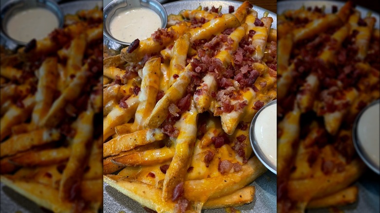 As we've learned is the case with many Outback Steakhouse menu options, the "Aussie" designation bears no actual Australian origins. But, it does add a touch of whimsy to dishes that are otherwise, well, pretty boring. In the case of Outback's Aussie cheese fries, this couldn't be more accurate. This appetizer consists of standard french fries — not hand-cut, but from frozen — with melted Monterey jack and cheddar cheese sprinkled with bacon bits.