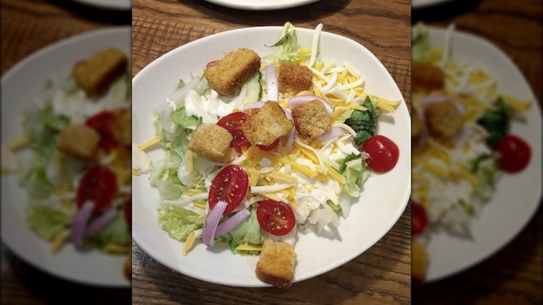 A classic Cobb salad involves chicken, bacon, tomatoes, hard-boiled eggs, blue cheese, and avocado served over romaine lettuce. Outback's version lacks chicken, avocado, and blue cheese, and the chain substitutes these essential elements with shredded Monterey jack and cheddar cheese and croutons. Blue cheese is supposed to add tang to tender chicken, while the avocado incorporates an additional layer of creaminess to complement the blue cheese. Without these crucial ingredients, Outback's version is merely a side salad with a little bit of egg and puny bacon bits.