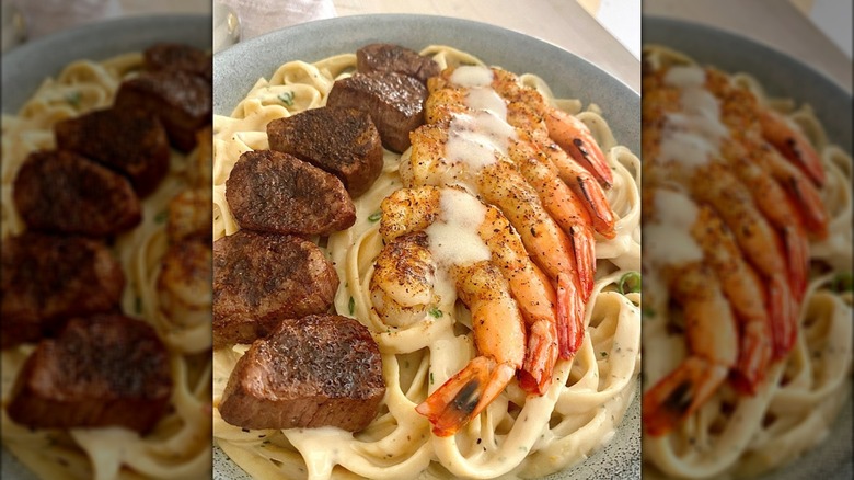 Surf and turf is one of the most appealing options at any steak house — and it's especially tempting if pasta is thrown in. At Outback, this dish is known as the Kingsland pasta:a blend of fettuccine noodles, steak medallions, shrimp, and Alfredo sauce. The Kingsland pasta is one of the house specialities, but in truth, it's special for all the wrong reasons.