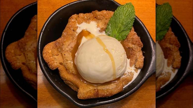 An eclectic caramel treat can really satisfy your taste buds when you're tired of classic chocolate or standard fruit-flavored desserts. Plus, sweet desserts with a noticeable salty addition bring otherwise nuanced flavors to life. Outback's salted caramel cookie skillet consists of a caramel-flavored cookie with chunks of white chocolate, nutty toffee, and pretzels. It's served piping hot in a cast iron skillet topped with vanilla ice cream, which adds cooling creaminess to this crunchy sweet treat. This dessert sounds nearly too good to be true, and much to the dismay of Outback's caramel-loving patrons, it is.