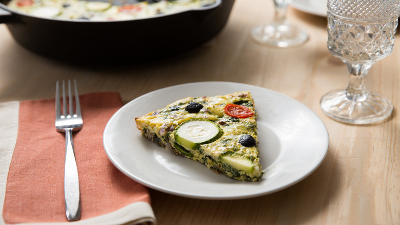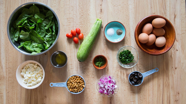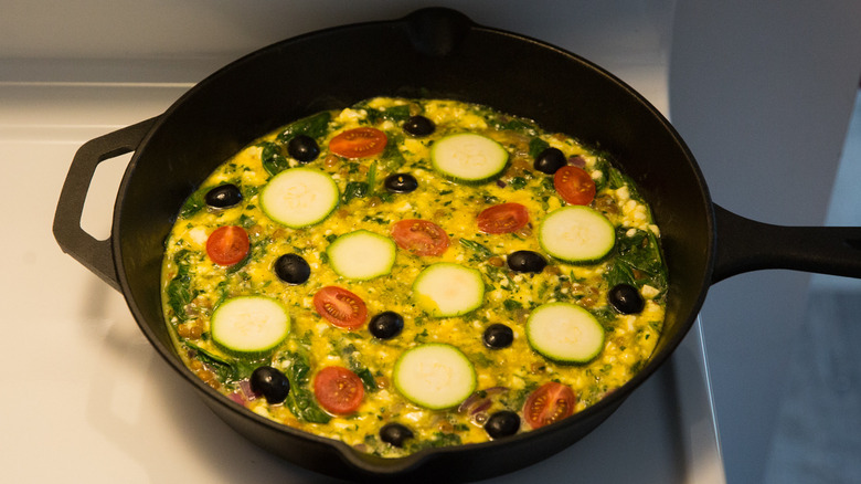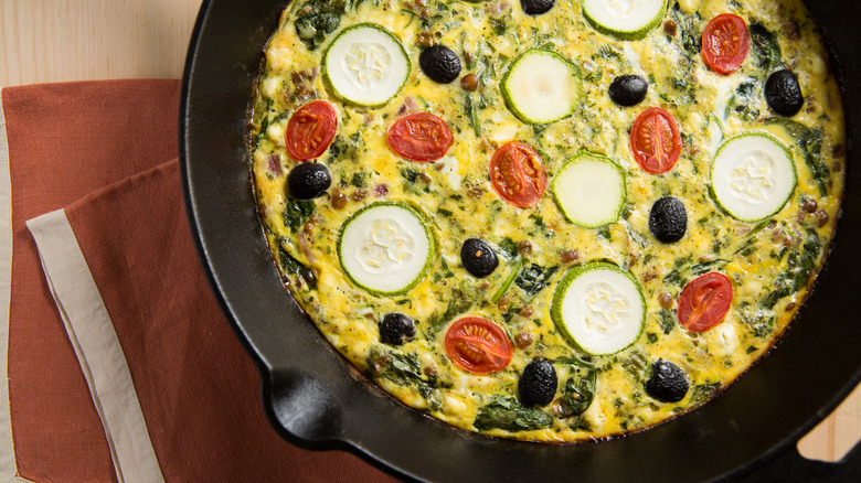 Feel free to play around with the vegetables. We used zucchini, tomatoes, and spinach, but other vegetables like mushrooms, asparagus, bell pepper, and eggplant would also be tasty. Make sure to cook them first so the frittata doesn't get soggy. In fact, roasting is a wonderful way to give them extra flavor. This recipe calls for red onion, but other alliums like garlic, shallots, or leeks work well. Instead of black olives, you could opt for kalamata olives. We know not everyone likes olives, and sun-dried tomatoes or capers are good alternatives.