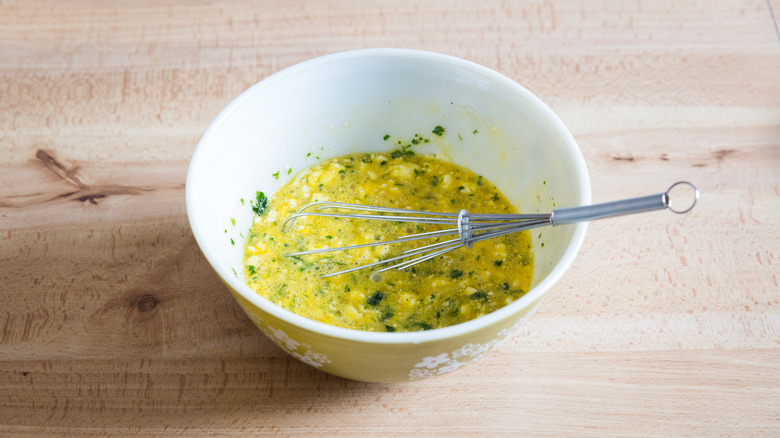 - In a large bowl, whisk together the eggs, feta, parsley, mint, salt, and black pepper. Set aside.