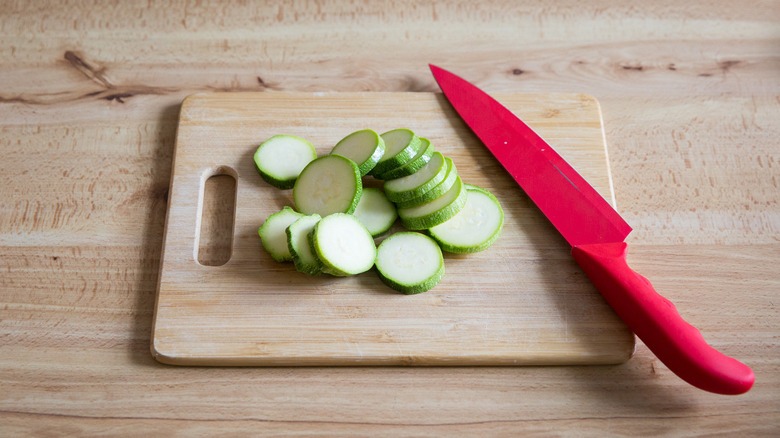 - Thinly slice the zucchini, making sure all the pieces are the same width, and set aside.