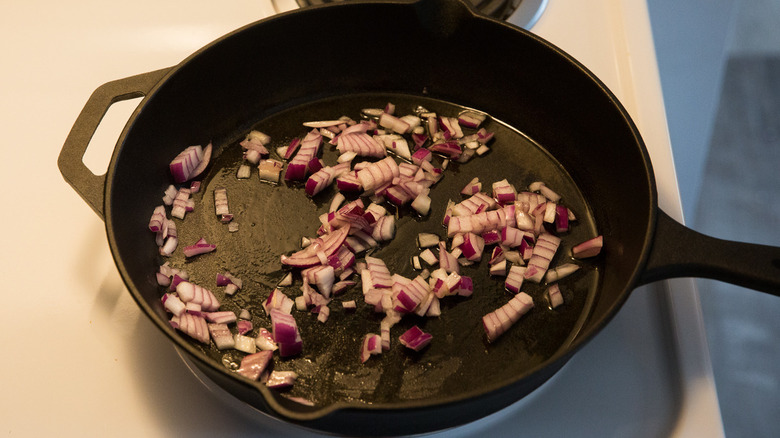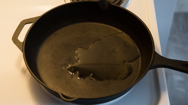 - Heat the oil on medium in a large oven-proof pan like a cast iron skillet.