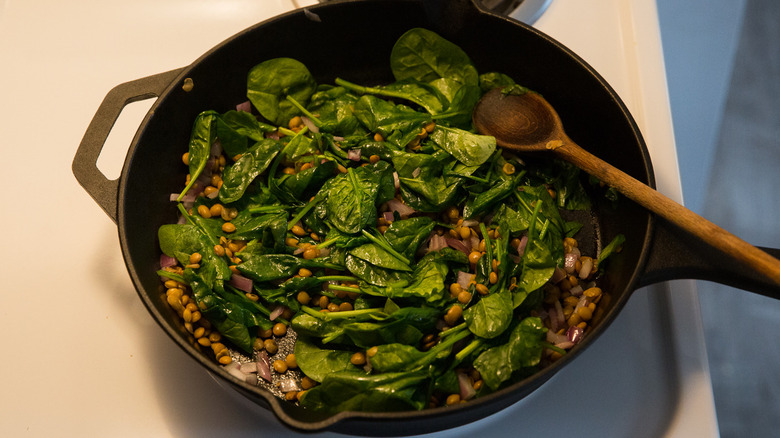 - Add the lentils and spinach and cook for 1-2 more minutes until the spinach is wilted. Remove the pan from the heat.