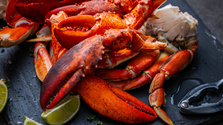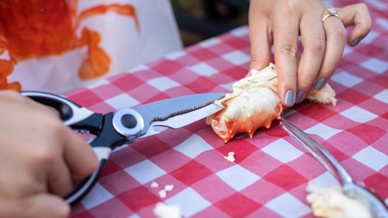 While your fingers and nails can do the dirty work, you may find more success — and lobster meat — when using precision tools like a shell cracker, kitchen shears, and a seafood fork or pick. That's because exposing the under-the-radar repositories takes a bit of finesse, gently coaxing out the meat instead of ham-fistedly pounding and squeezing. That also makes it a good idea to let the lobster cool first for surer handling. Otherwise, attempting the archaeology on a steaming hot lobster may turn slapstick quickly, while burning your fingers to a similar shade.