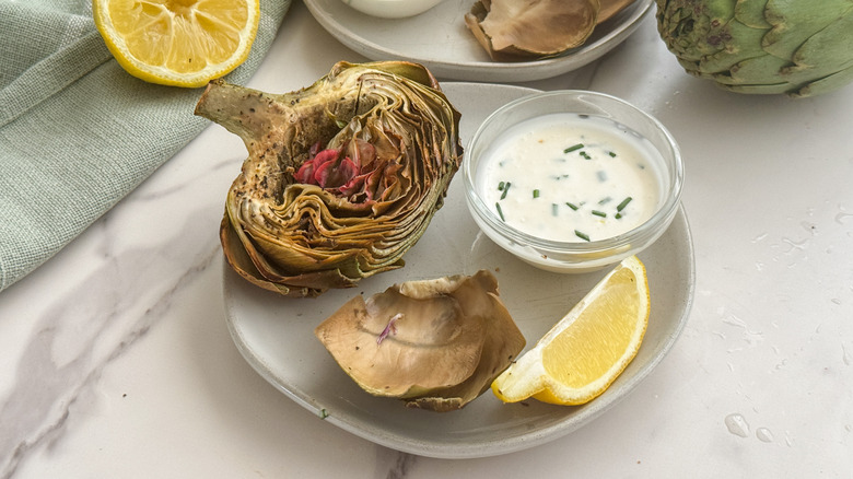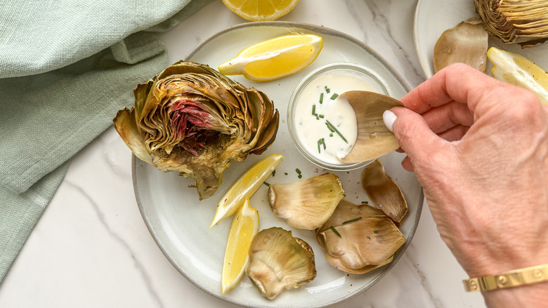Step 11: Serve the artichokes with garlic dip