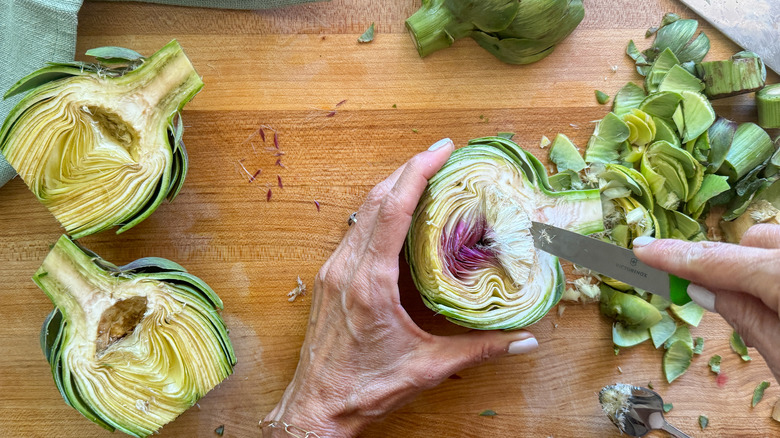 - With a sharp knife cut out the fuzzy part of the artichoke.