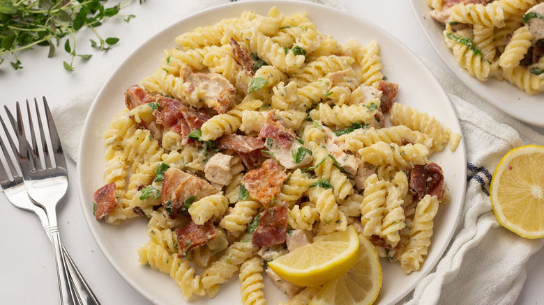 Whether you make homemade buttermilk ranch dressing, opt for your favorite store-bought brand, or turn to a packet of ranch seasoning, the dressing works well with many different ingredients. This chicken bacon ranch pasta recipe, for example, features classic pairings and is super easy to make. It can be chilled and served as a cold pasta salad, making it great for lunch, a side dish, or for eating right out of the bowl. Additions like red onion, bell pepper, tomatoes, or even cheddar cheese can help you add your own spin to the dish.