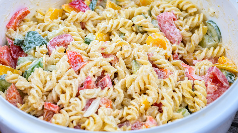 Pasta salad is great any time of year, but there's something about the hot, summer months that really makes it shine. Maybe that's because it's good to have on hand when it's too hot to cook and also perfect for bringing to gatherings. It's also easy to whip up, refrigerates well, and gets even better with time. There's no shortage of ways to prepare pasta salad, with seemingly endless opportunities to customize using your choice of veggies, meats, cheeses, other mix-ins, and plenty of flavorful dressings. Ranch is an iconic option which can add zing and nostalgic flavor to your pasta salad and delight everyone's tastebuds.