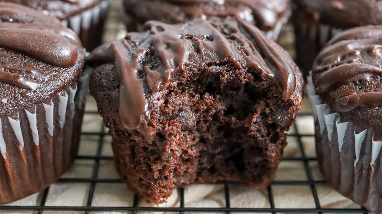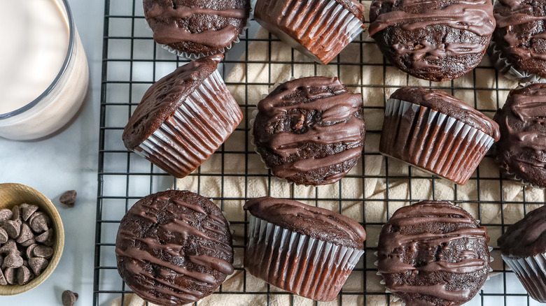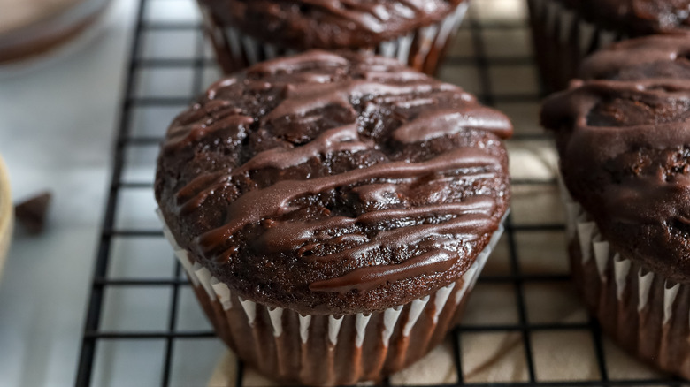 There are two types of chocolate in the muffin batter itself — cocoa powder and chocolate chips — and the chocolate ends up being used three ways. While plain chocolate muffins might just contain cocoa powder to give the batter a chocolate-forward flavor, death by chocolate muffins aim to amp things up a little bit. The real cherry on top is the ganache drizzle, however, which transforms these baked goods into something straight-up moreish and decadent, also two characteristics that often come into play when talking about death by chocolate.