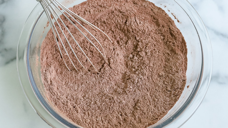 - In a medium bowl whisk together the flour, baking soda, salt, and cocoa powder until combined. Set aside.