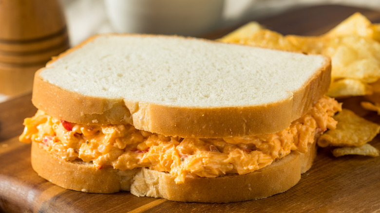 What's in a classic homemade Georgia pimento cheese sandwich? It consists of two buttery toasted pieces of bread and a spread made with shredded cheddar cheese, chopped pimentos, mayonnaise, hot sauce, sugar, garlic powder, onion powder, and salt.