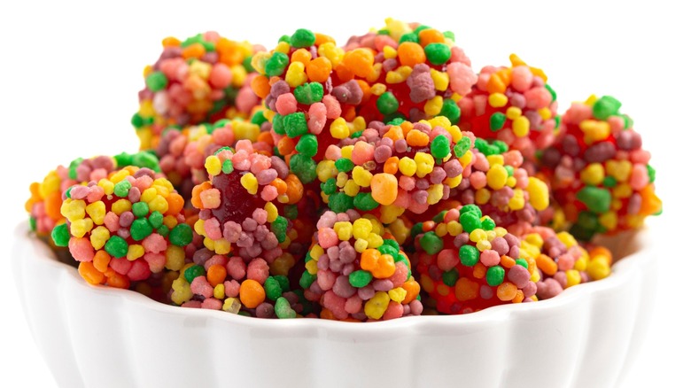 First, spread the loose candy in an even layer on a baking sheet lined with parchment paper. Then, microwave 2 cups of gummy bears for a minute and a half to two minutes, or until they're mostly melted — and if they're not all the way there, just stir until the mixture is smooth. Once you coat balls of melted gummy bears with Nerds on all sides, toss your sheet in the fridge for a couple hours. You'll end up with tons of little clusters that will stretch and taste just like the real thing.