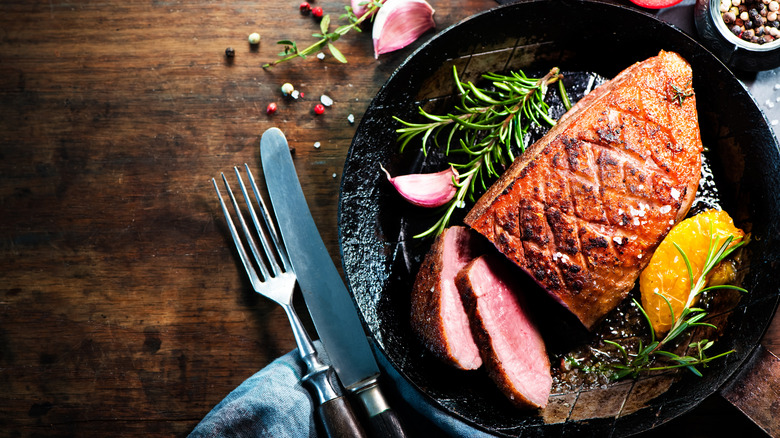 Duck is an incredibly flavorful type of poultry, and you wouldn't be blamed for thinking you don't need much to make it taste great. But there are so many ways to add flavor to duck, whether roast or pan-fried, that it would be a shame to serve your duck plain. Whether it's by making a luxurious jus using the duck drippings or by seasoning your duck with various spices and herbs, you can get creative and work with what you've got in your kitchen.