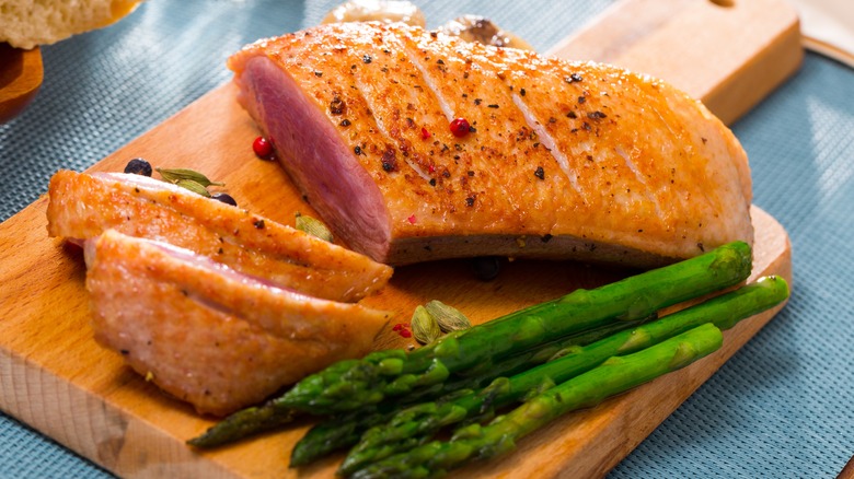 Many home cooks are too intimidated by duck to cook it themselves and perhaps see it as out of their reach. However, it's easier to cook duck than you think as long as you keep a few things in mind. Duck has darker meat than chicken and is higher in fat. The fat is almost entirely under the skin, making it a relatively lean piece of meat covered in a thick layer of fat. In truth, unless you live in France or China, for example, duck is a little bit less commonly eaten. That makes it harder to find in your grocery store or butcher shop, and when you do, it will be more expensive than chicken. Due to its richness and price, duck meat is reserved for special occasions like Thanksgiving or Christmas, which is unfortunate, as it's truly versatile poultry.
