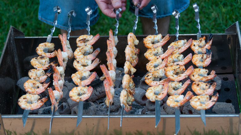 Shrimp and prawns are at the small end of the shellfish spectrum, so they're harder to pick up and move on the grill. While you could throw a bunch on and use your tongs to flip each one individually, it's going to take a while and you'll probably end up with a pretty uneven cook at the end. That's why Hemsley tells us it's better to use skewers for this particular shellfish.