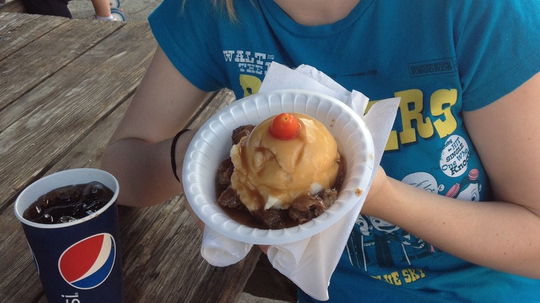 Beef sundaes aren't at all fairs — but they really should be. They're essentially savory sundaes, made with a scoop of mashed potatoes, drizzle of beef gravy, cheese, sour cream, and a cherry tomato on top. These ice cream cone look-alikes are absolutely divine and quite creative, which earns them a spot in the fair food hall of fame.