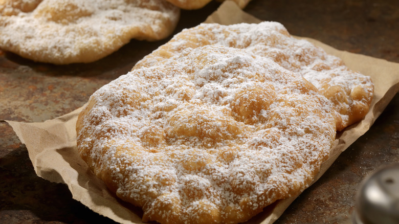 Fried dough and funnel cake aren't synonyms. "Fried dough" refers to the large, circular discs of dough that are dropped whole into the deep fryer before being coated in a layer of cinnamon sugar or powdered sugar. You may know them as elephant ears or beaver tails, depending on what state (or country) you're from.