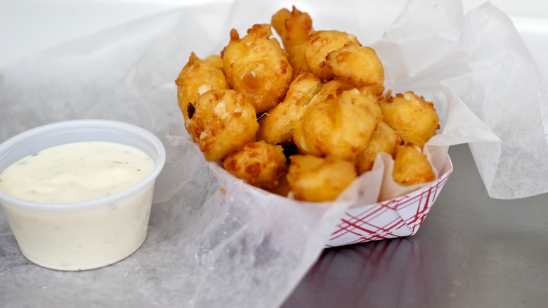 Think about if you could make a hybrid between a mozzarella stick and a french fry — that's a fried cheese curd. You can also elevate them even more with dipping sauces. The one thing that fried cheese curds lack, compared to the top items on this ranking, is that they're more of a side dish than an entire meal, which will undoubtedly lead you to scrounge for something else at the fair.