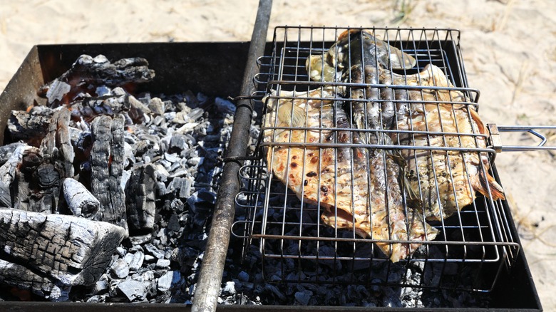 The different methods for roasting whole fish over a campfire all have their advantages. A stick is the most rudimentary method that requires the least amount of equipment and provides the clearest visual and tactile cue for doneness. Simply spear a whole fish through the center of its vertical body and roast, turning halfway through. A grill basket is similar to a stick, but the basket is easier to handle. With direct contact with the embers or coals, the fish will incur a nice smoky, earthy flavor. You can spray the fish with cooking oil or brush butter onto the skin and sprinkle with seasonings before spearing it.