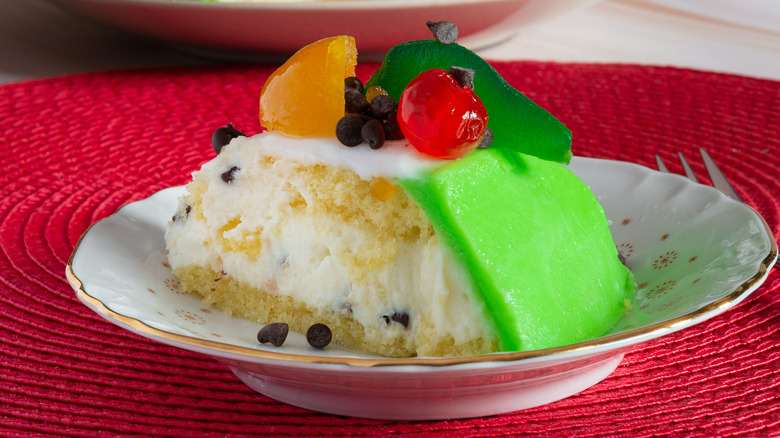 Cassata is essentially a sponge cake infused with syrup, filled with ricotta and plenty of candied fruit, and covered in a thin layer of marzipan. The ice cream flavor doesn't just incorporate a slice of cassata, though. It instead recreates the dessert using many of the same ingredients — namely the candied fruit, ricotta, cream, and sugar. In other words, don't expect to find any sponge cake in your ice cream. While Ben & Jerry's and other American ice cream brands have hit the mark by mixing cake or cookie bits into their ice creams, very few (if any) Italian gelatos follow a similar format.