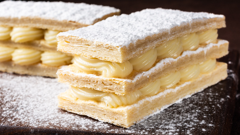 An Italian dessert made with layers of flaky puff pastry and vanilla cream, millefoglie literally means "a thousand sheets" in Italian because of the stacked appearance of the puff pastry layers. Very similar to the French pastry known as "mille-feuille" (which also translates to "a thousand sheets" in French), this dessert lends itself particularly well to ice cream form because of all that cream and pastry.