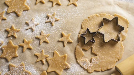Simply cut two pieces of parchment paper that are large enough to cover your baking sheet and set them on the counter. Once you've mixed your cookie dough together you can either wrap and chill it in the fridge first, which will make it easier to roll out later, or immediately place it between the two sheets of paper, roll it out fully and refrigerate it afterwards. The greaseproof nature of the parchment paper, which is coated in food-safe silicone (depending on the brand), will allow you to roll out the dough effortlessly without it sticking while creating a clean barrier between the mixture and the counter. If you find that the paper is moving around on your worktop, place a cloth underneath it to hold it in place. Once chilled, you can remove the top sheet and cut out your cookies with your cutter, remembering to dip them in flour first for crisper edges.