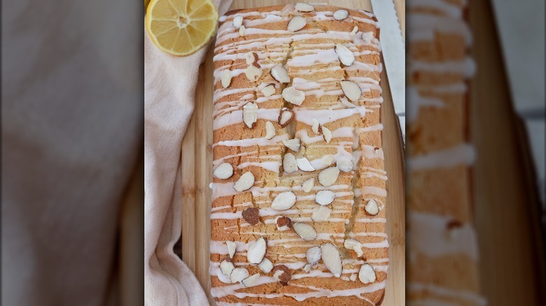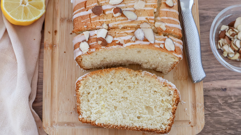 The lemon almond bread is a sweet-but-not-too-sweet bread — Morrone specifies that it's not as sweet as a cake, so it's more in line with something like chocolate chip banana bread. And what really makes it unique is the pairing of lemon and almond. The lemon — in the form of lemon zest — brings in a bright, citrusy flavor that makes the bread's overall flavor more dynamic. Additionally, the loaf is coated with a glaze made of powdered sugar and lemon juice, so the sweet, zesty lemon will definitely come through in each bite. Meanwhile, the almond brings in a nuttiness that balances out the citrusy sweetness of the rest of the bread. Thanks to the sliced almonds on the top of the loaf, there's also a satisfying crunch to go along with the nutty flavor infusion. Along with the sliced almonds on top, the loaf is also made with both almond flour and almond extract so the nuttiness is prominent and evenly distributed throughout the loaf.