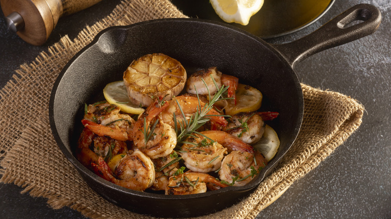 When it's time to start pan-searing, opt to sear cold shrimp in a cold pan to produce plumper, evenly bronzed shellfish. Likewise, using less oil and relying on medium-high heat will lead to golden and scorch-free results. We also recommend spacing out the crustaceans to encourage crisp exteriors, much like not moving them much — flip them only once they've turned opaque, which should happen within minutes. Just like that, perfectly pan-seared shrimp should cease to be scary. So, put your newfound wisdom to the test and whip up sensational seared shrimp bruschetta today!