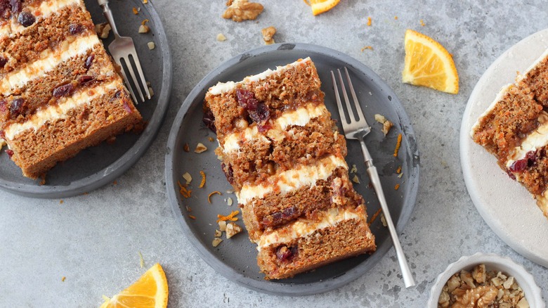 While pineapple is a tried and true method of perking up a carrot cake, it's certainly not the only additive that can make the cake better. One common added ingredient is nuts, usually walnuts or pecans, which can be mixed in the batter (if finely chopped), thrown on top for decoration, or both. Some recipes even suggest toasting the nuts for a deeper flavor, but either way, you'll get an earthy flavor and crunchy texture.