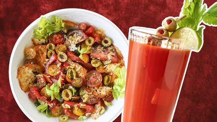 The flavors that make up a classic Bloody Mary — tomato, celery, salt, horseradish, olives, lemon, hot sauce, black pepper, etc. — work wonders in a glass. That said, they needn't be contained to just one beverage or even be married to alcohol to be appreciated together. When summer tomatoes are ripe and delicious, consider turning them into a salad with a healthy dose of inspiration from a Bloody Mary. Tomatoes, celery, cucumbers, and olives make up the bulk of the salad, providing tartness, salt, and crunch in every bite. Even blood-red beets would be welcome. The dressing should lean heavily on staples like hot sauce, Worcestershire sauce, lemon juice, and horseradish, giving spice and zing to the vegetables below.