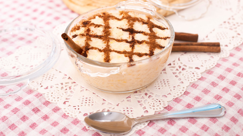 Arroz doce is one of the most traditional Portuguese desserts, frequently home-cooked during holidays, long lunches, and other festive events. It's a comforting dish that consists of short-grain rice that's prepared to a very creamy consistency, sweetened with sugar, and flavored with cinnamon and lemon. Cooks either boil the rice in water first, and then fold in further ingredients, or directly cook the grains in spiced milk. To further amplify the custardy texture, egg yolks are added at the end of the preparation. Plus, this introduction lends to the dish a pleasant yellow hue, as also observed in Portugal's unique pastel de nata. Unlike this baked good, arroz doce is enjoyed right after preparation, although some also refrigerate it and eat it once cooled.