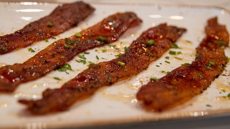 Thick-cut bacon is ideal for anyone who wants meaty bites, but some recipes swear regular bacon is best to achieve the ultimate crunch. Either way, try to cook the bacon on a wire rack so the fat has a place to escape, which allows the pork to crisp better. Line the baking sheet with aluminum foil for an easy cleanup — but don't dare to throw away the rendered bacon fat because it's a flavorful cooking fat for an array of dishes. You can season the bacon with brown sugar, honey, maple syrup, and even add booze for more flavor or spice things up with red pepper flakes.