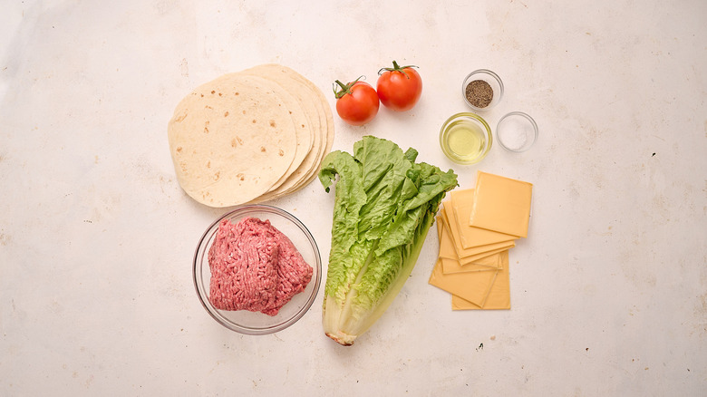 The first things you'll need for smash burger tacos are ground beef, salt, and pepper. For juicy burgers, choose a ground beef that is 80% to 85% lean. With this recipe specifically, the added grease is useful in browning the taco shells. For tortillas, choose a flour tortilla that is about ½-inch larger than the burger patty; for most, this will be about 6 inches, or a standard tortilla. You'll also need a neutral oil with a high smoke point, such as grapeseed or avocado, because you will cook the burgers in a very hot skillet. From there, you'll just need the toppings: Lettuce, tomato, and American cheese.