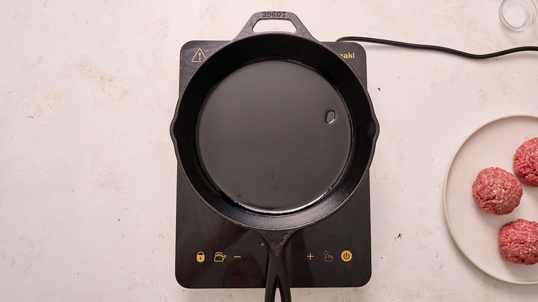 Add the beef to the skillet, working in batches, as needed. Immediately press the meat into ¼-inch patties using a spatula or burger press.