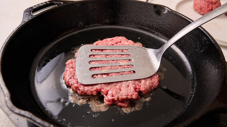 - Add the beef to the skillet, working in batches, as needed. Immediately press the meat into ¼-inch patties using a spatula or burger press.