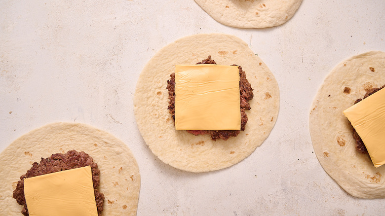 - Divide the ground beef between the tortillas and add a slice of American cheese to each tortilla.