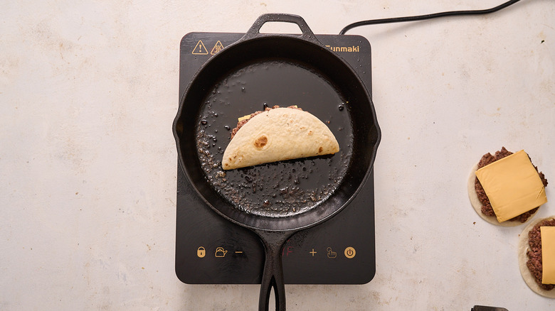 - Flip the taco half and brown the other side for about 30 seconds.