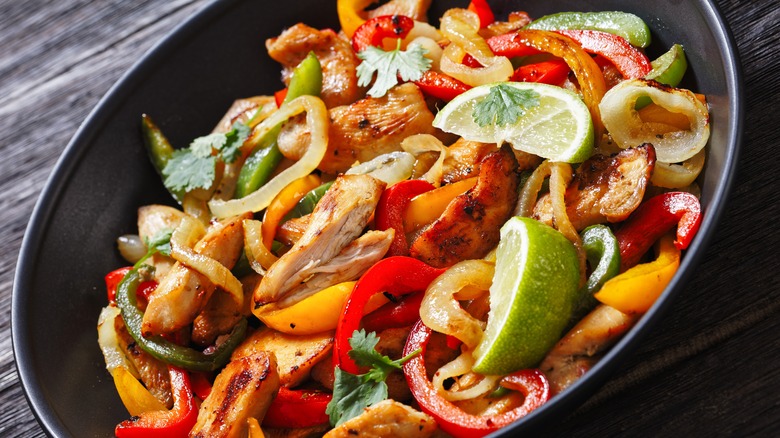 Because you're using higher temperatures here, selecting the right type of cooking fat is key. The smoke point of avocado oil climbs up to a whopping 500 degrees Fahrenheit, which is why it's the best choice for fajita veggies. This means that your oil can be cooked at high heat without the risk of it smoking, so you'll avoid a burnt flavor in your food and potentially detrimental health conditions (such as the release of free radicals) in your kitchen. But luckily, this avocado-based product is also the best pick flavor-wise, as it blends in perfectly with fajita seasonings and toppings like salsa, guacamole, sour cream, lime wedges, and avocado slices.