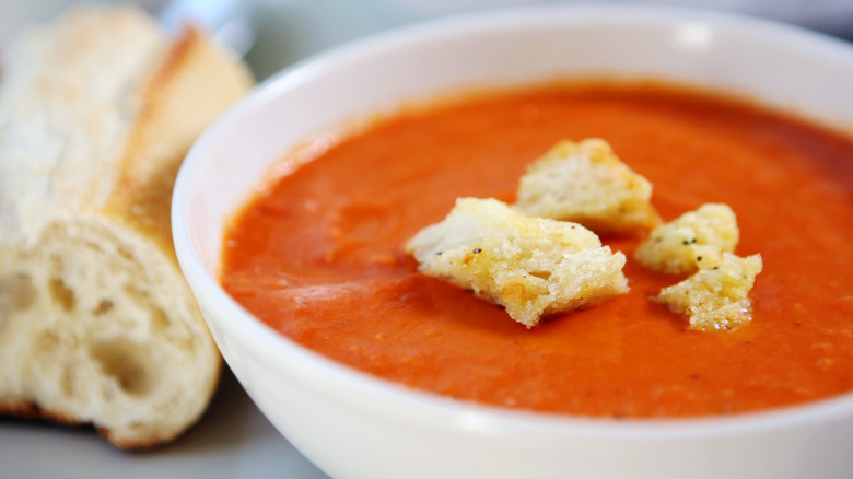 If you don't have a grilled cheese sandwich at the ready, crusty bread makes an excellent alternative pairing for your soup. There's just something so satisfying about twisting and ripping off a massive hunk, Panera Bread-style, and dipping it in steaming bowl of warm tomato soup. You can soak up the soup with your bread, or opt to alternate between bites — which is perfect if you're not fond of soggy bread.