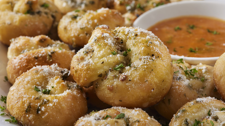 Garlic knots are garlic bread's fun cousin. Unlike classic garlic bread, which comes out of the oven crunchy and occasionally devoid of moisture, garlic knots are plush, soft, and perfectly dippable. Chef Tourondel serves his tomato soup with these knots instead of grilled cheese, and shares that the swap "could easily be replicated at home."