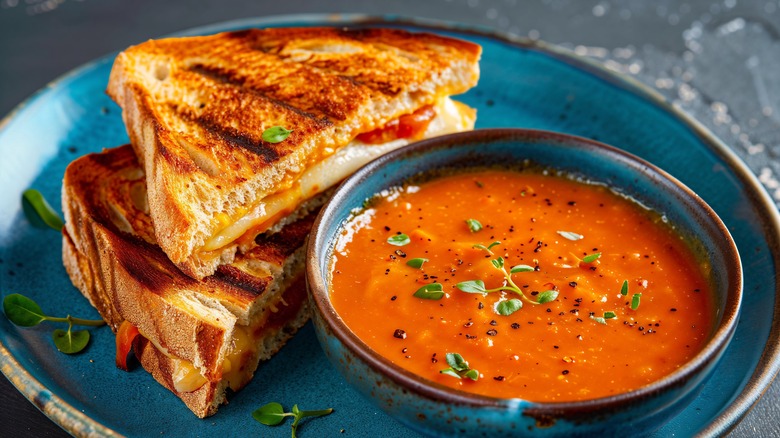 Although grilled cheese is merely bread, cheese, and a spread to ensure the entire thing cooks correctly, there are ample ways to spruce up your grilled cheese and make it a tastier pairing for your soup. Swapping out your standard sliced cheese with a medley of other options, including gouda or gruyere, is an easy way to make this sandwich more sophisticated. Chef Laurent Tourondel recommends making the sandwich "extra special" with thinly sliced tomatoes, Vermont cheddar cheese, and a slice of bacon.